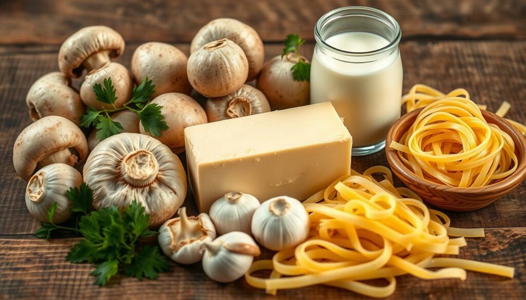 To make the perfect creamy mushroom pasta, you need special ingredients. You’ll need pasta, mushrooms, and a creamy sauce. Each part is important for a great taste.